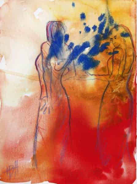 Der er flere faser i processen: Først lægge baggrunden i vådt i vådt-teknik, og tænke at det her bliver vist noget værre rod. Så se, hvad der alligevel opstår undervejs. Igen skal det gå utrolig hurtigt, og der er ikke noget med at fedte rundt med penslen, så alle farverne løber sammen til en ubestemmelig brun nuance.