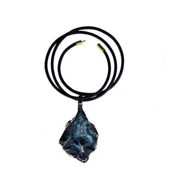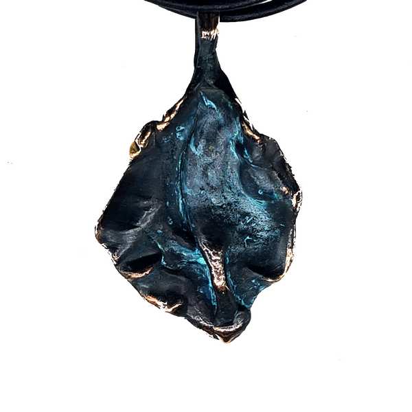 Et enkelt og unikt bronze halsvedhæng som har lidt af bladets former. Den sorte og blå patinering fremhæver bronzens varme gyldne farve.